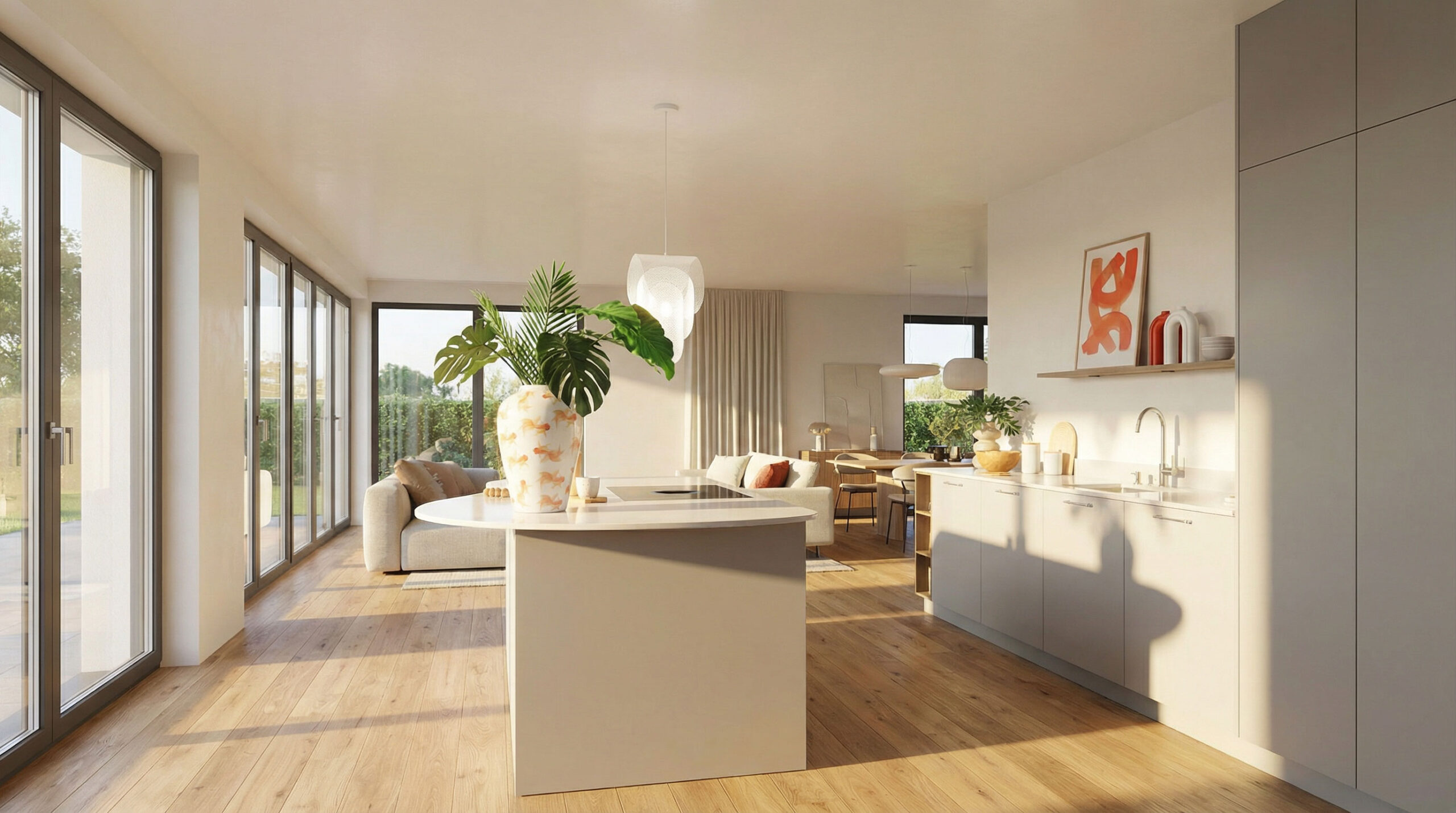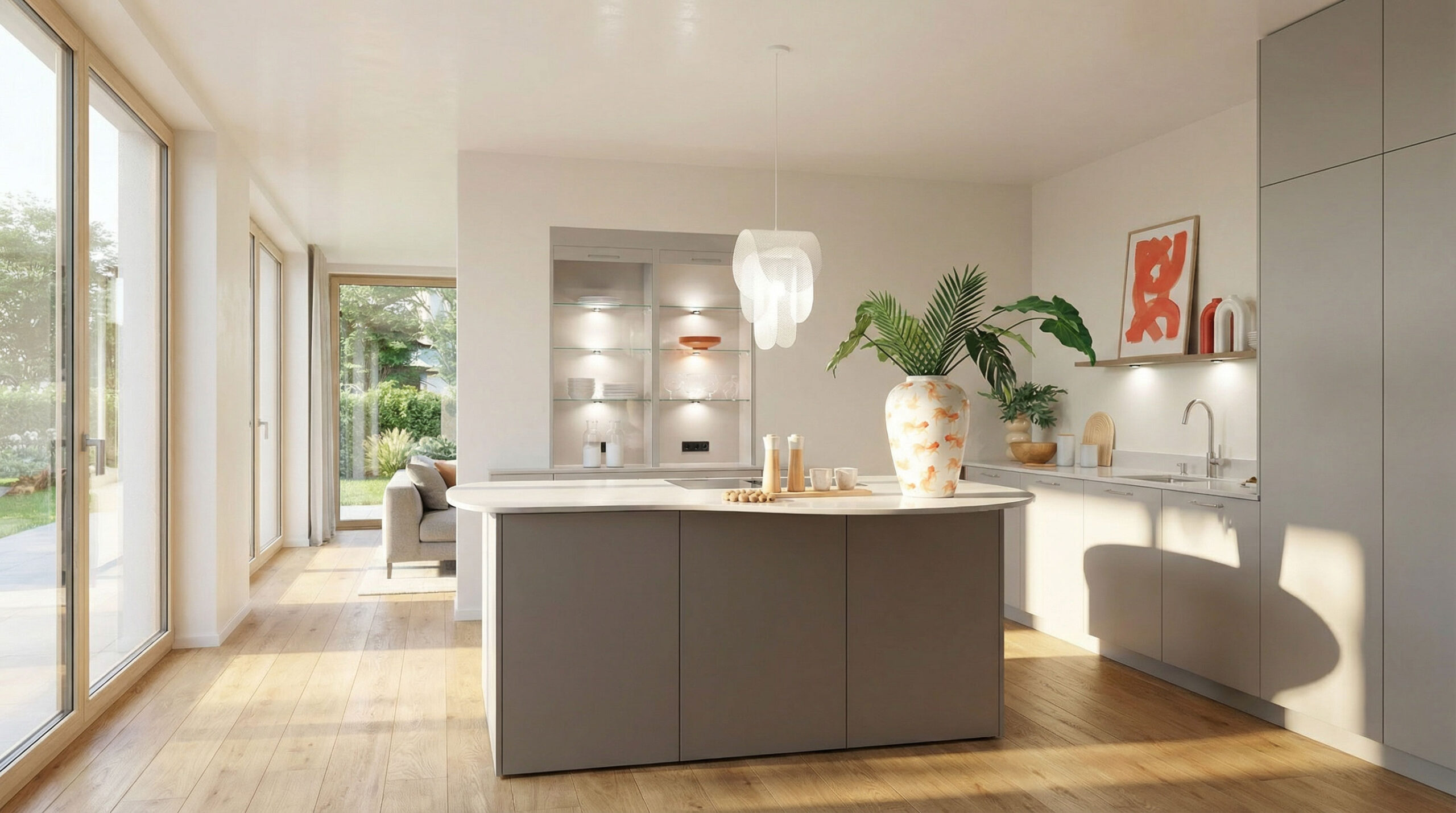 Die Gestaltung von Camille folgt einer klaren, skulpturalen Formsprache: bodentiefe Türen, grifflose Fronten mit Tip-On-System und eine organisch geformte KEMIE-Arbeitsplatte verleihen der Küche eine fast weibliche Eleganz. Die Farbwelt ist bewusst ruhig gehalten: Fronten in Sabbia supermatt (702) treffen auf Korpusse in Sandbeige seidenmatt (129) und schaffen eine warme, wohnliche Atmosphäre mit moderner Zurückhaltung. Ein edles Detail setzen die edelstahlfarbenen Griffprofile (728), die sich dezent in das reduzierte Design integrieren. Ergänzt wird das Materialkonzept durch hochwertige Sockel- und Sichtseiten in Sabbia supermatt. Die Küche wirkt dadurch wie aus einem Guss – ruhig, hochwertig und architektonisch klar. Besonders eindrucksvoll ist die freistehende Insel mit ihrer weich gerundeten, organischen Arbeitsfläche, die den Raum auflockert und zugleich als kommunikativer Mittelpunkt dient.
