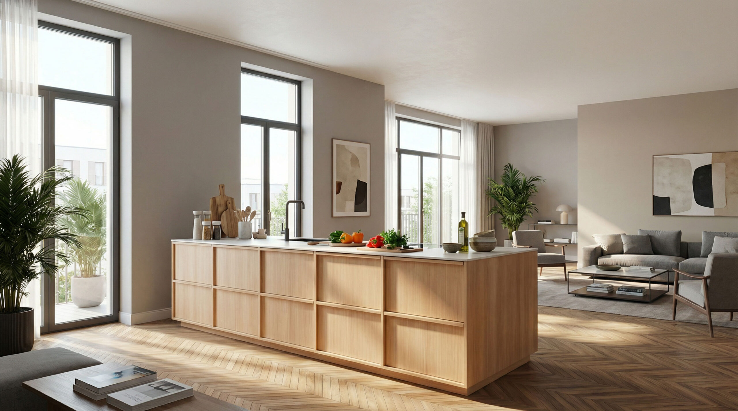 Sockel und Sichtseiten greifen das Holzkonzept konsequent auf. Als Arbeitsfläche kommt eine helle Marmor-Arbeitsplatte zum Einsatz, die dem Ensemble Leichtigkeit und Eleganz verleiht. Die Küche ist grifflos gestaltet und mit dem komfortablen Tip-On-System (999) ausgestattet. Ergänzt wird das Öffnungskonzept durch ServoDrive, das ein besonders sanftes, motorisches Öffnen ermöglicht. Die Planung basiert auf einer ergonomischen Arbeitshöhe von 780 mm. Der Grundriss zeigt eine großzügige Insel mit rund 3.000 mm Arbeitslänge sowie eine klare Zonierung zwischen Vorbereiten, Kochen und Stauraumwand – typisch für moderne Wohnküchen mit architektonischem Anspruch.