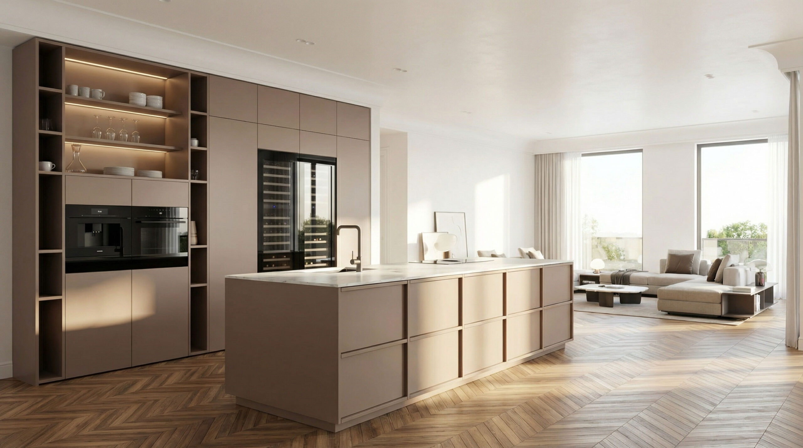 Hinter der ruhigen Frontgestaltung verbirgt sich ein hochfunktionales Innenleben. Das Wangenregalsystem bildet eine elegante Präsentationsfläche für Geschirr, Bücher oder Dekoration und verleiht der Küche einen wohnlichen Charakter. Der integrierte Spacetower sorgt für ergonomische Abläufe beim Backen, Kühlen und Lagern. Eine Frontverlängerung in bodentiefer Ausführung lässt die Schrankwand wie ein architektonisches Raumelement wirken und schafft eine klare, aufgeräumte Linienführung.