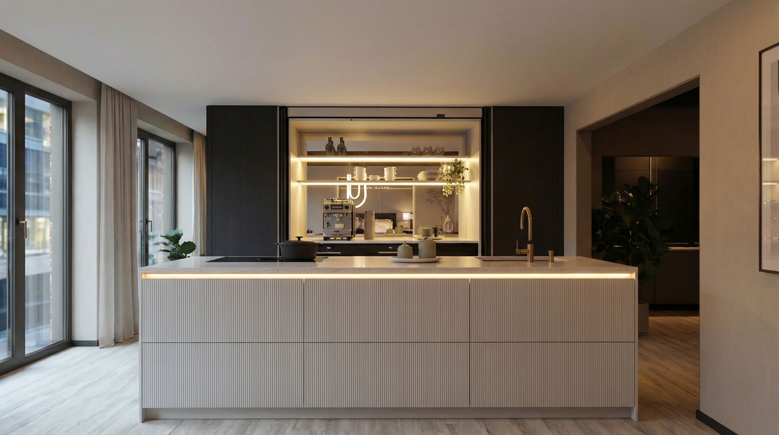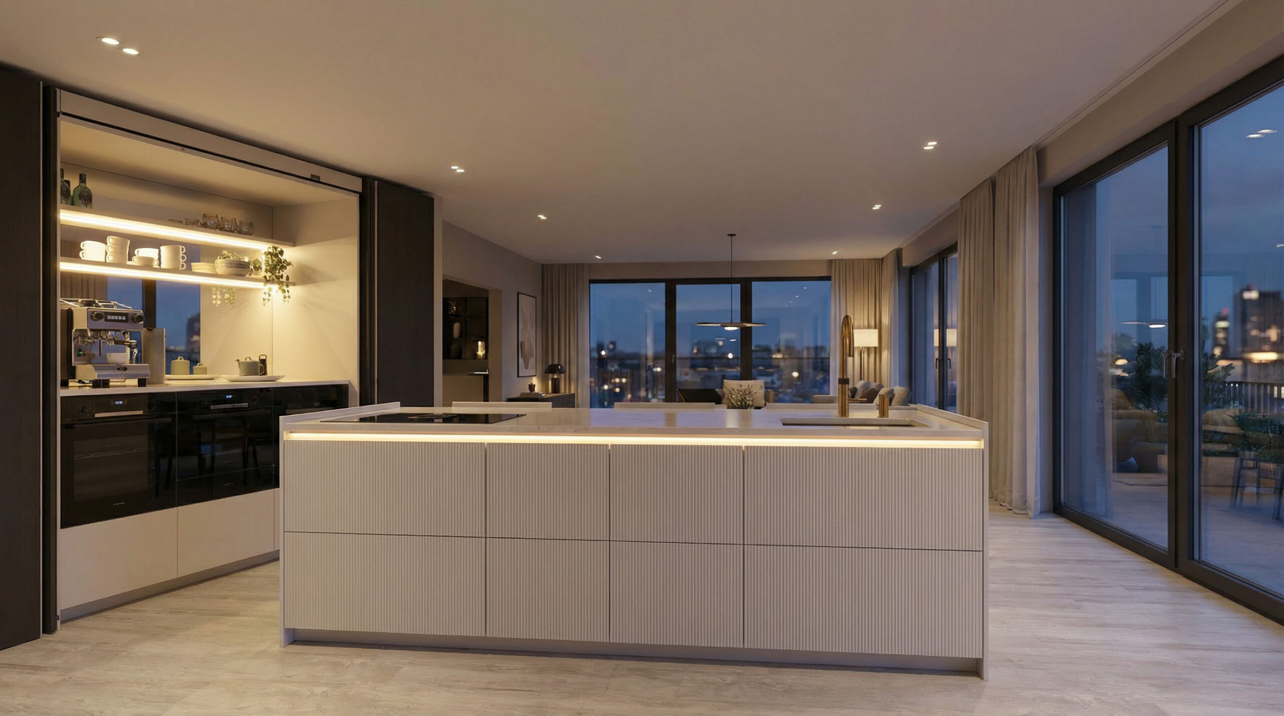 Architektonische Wohnküche in Sandbeige, Eiche und Goldquarz