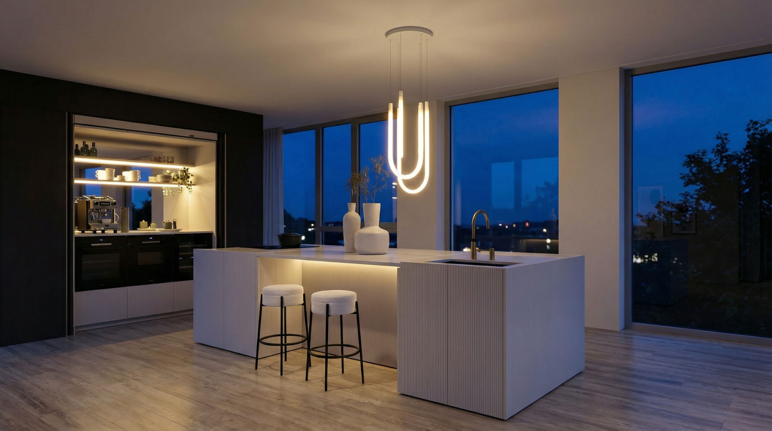 Ein architektonisches Highlight sind die bodentiefen Türen sowie die bodentiefen Formwangen, die die Küche wie ein fest integriertes Raumelement erscheinen lassen. Die Frontverlängerung unterstreicht die klare, wandartige Linienführung.
