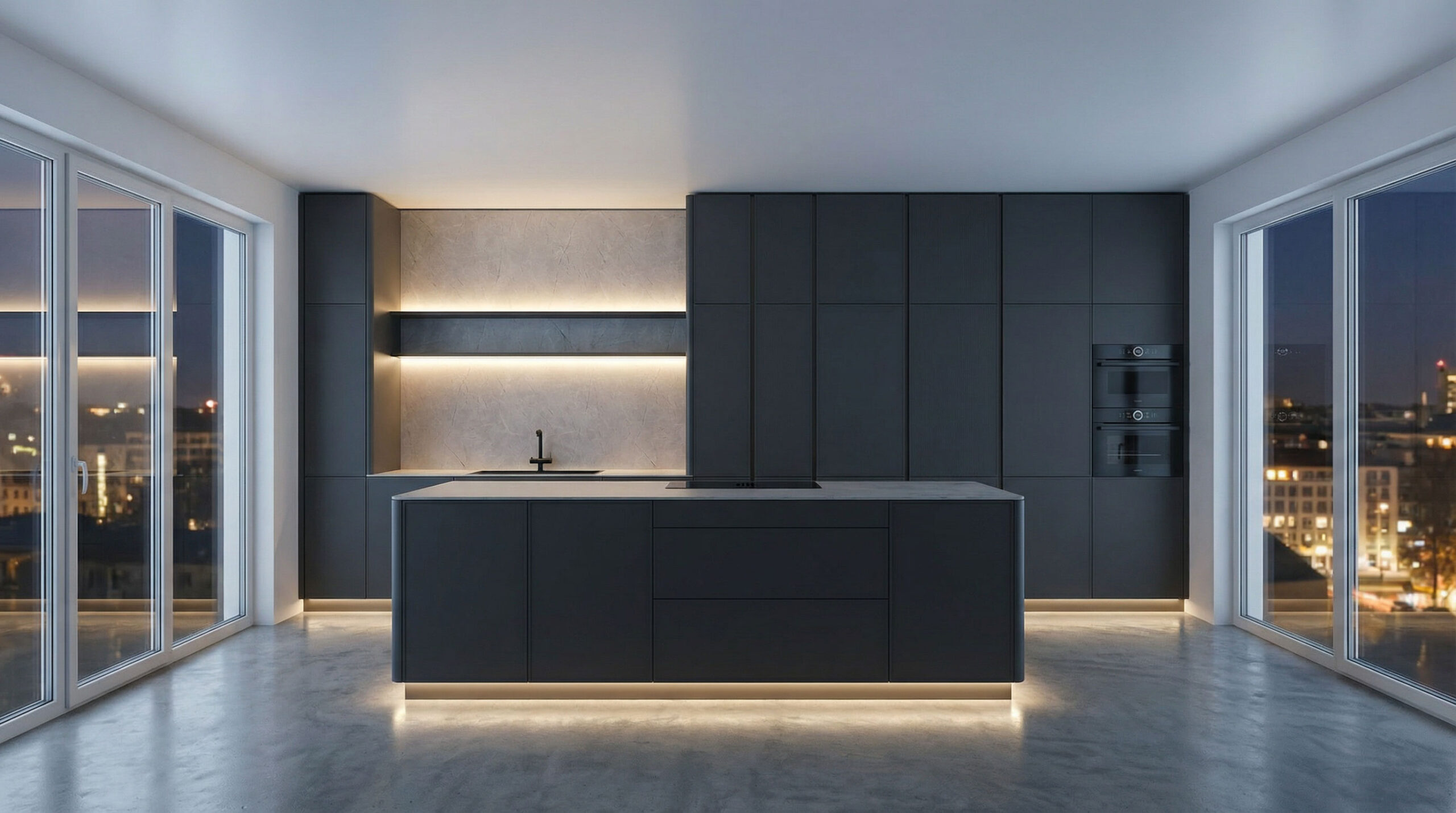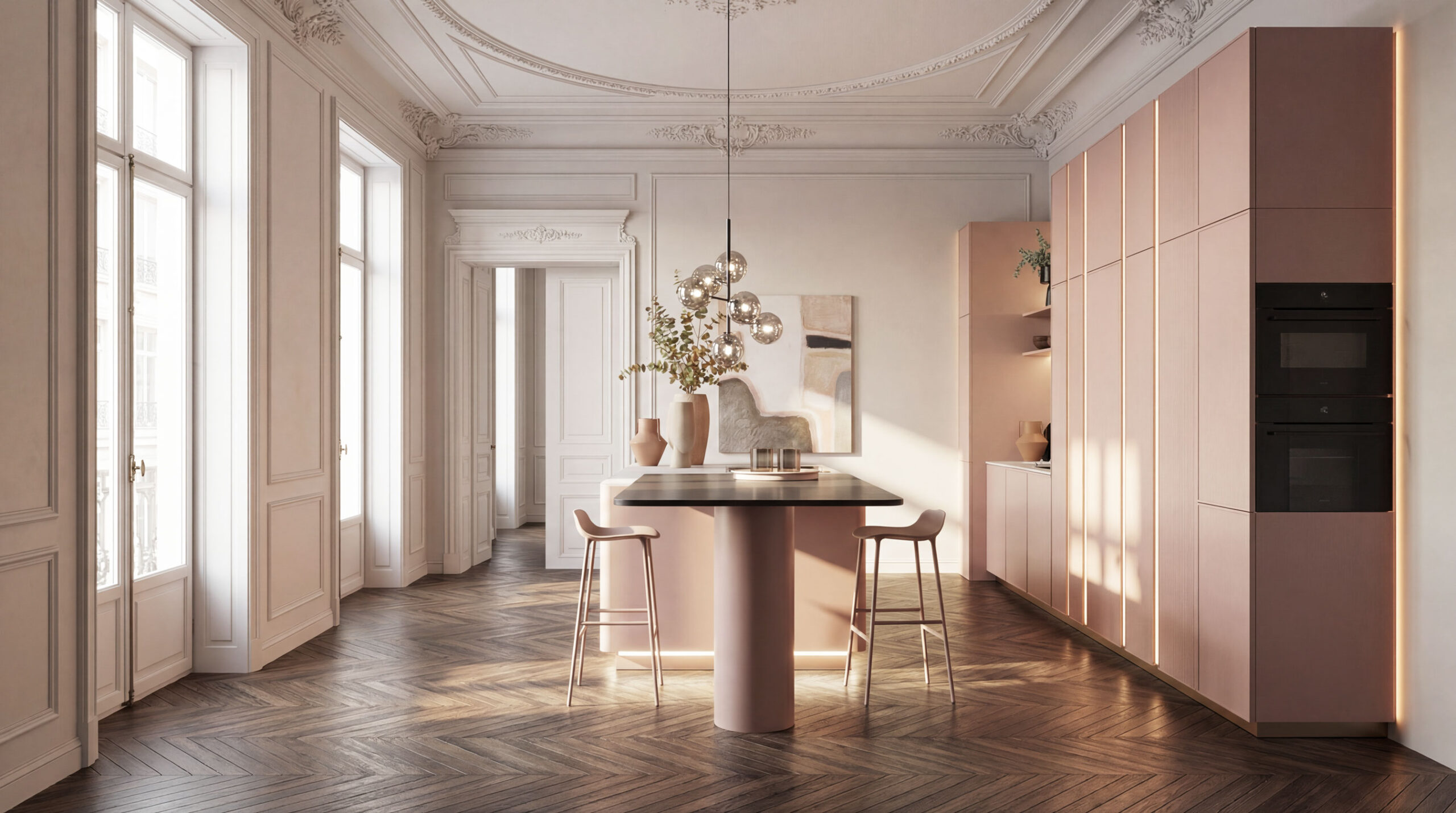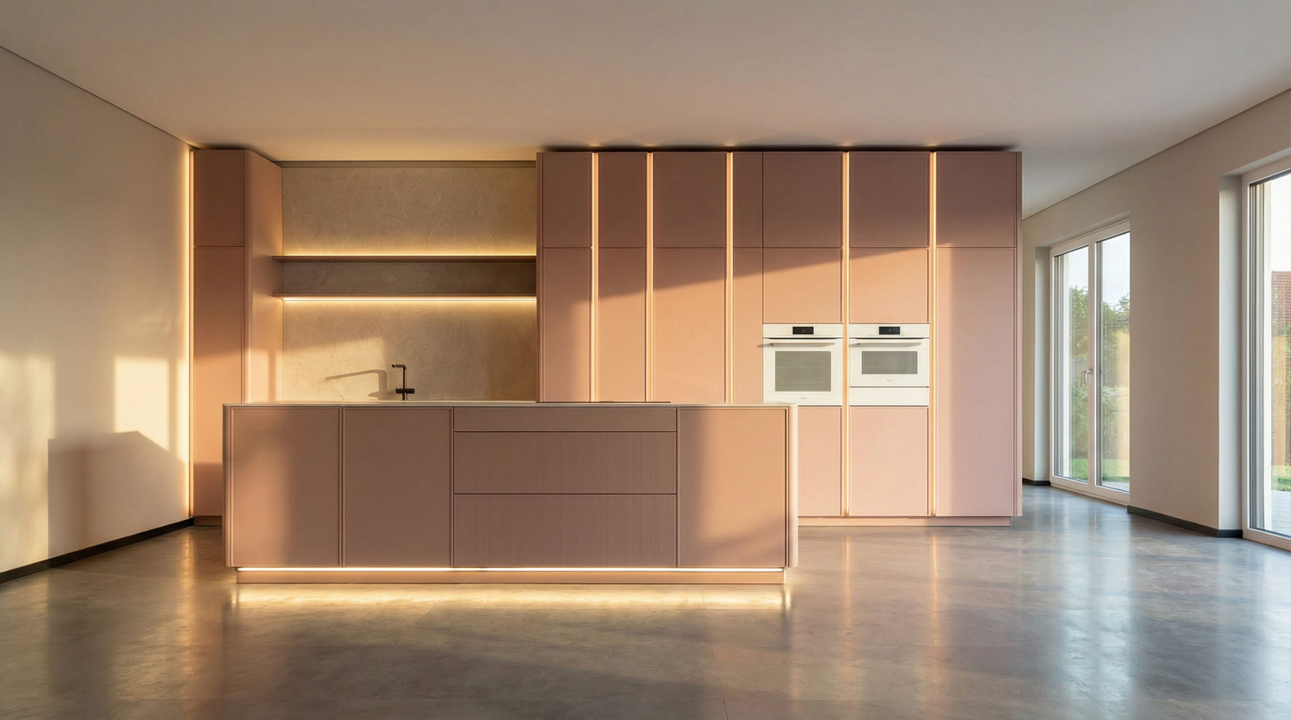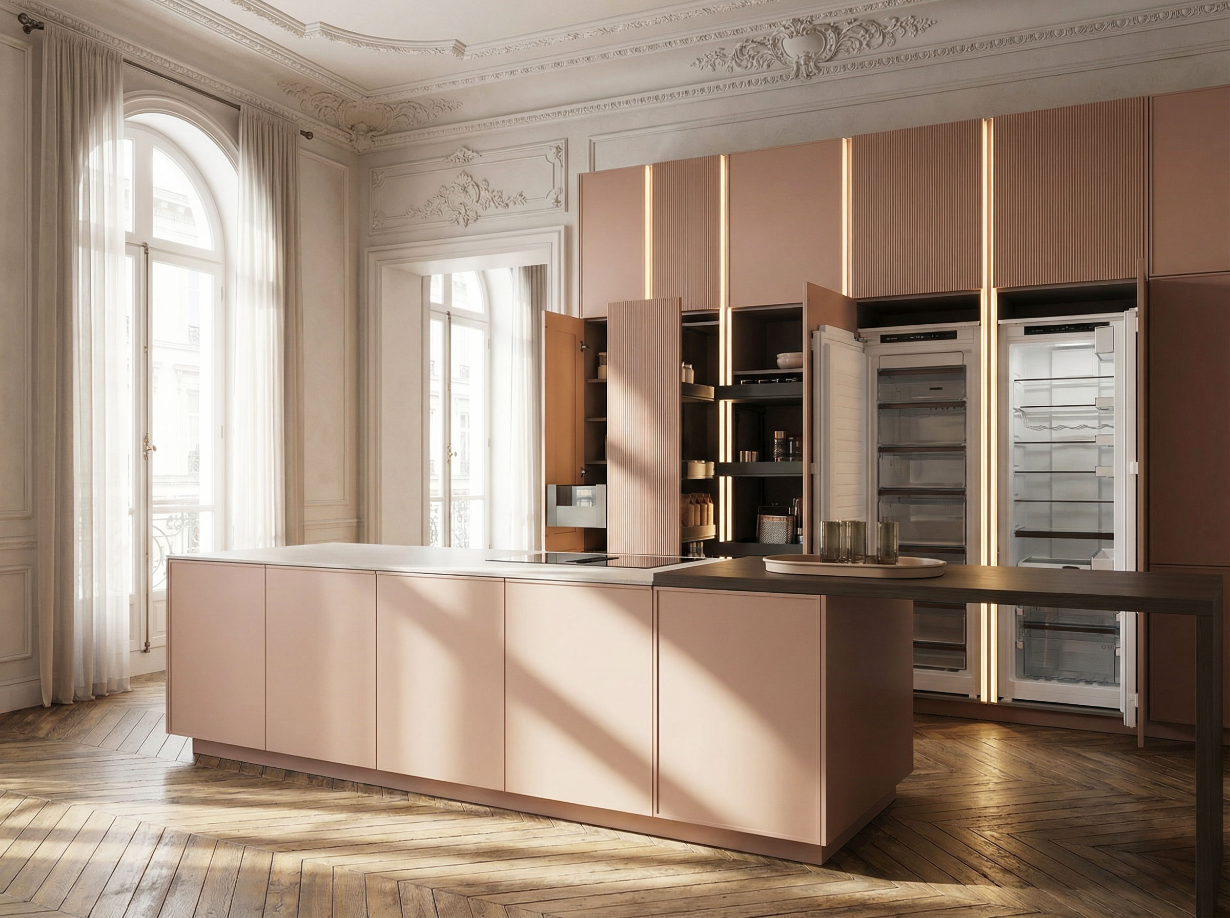 Die Fronten in Blush strukturmatt verleihen der Küche eine außergewöhnlich ruhige, fast samtige Ausstrahlung. Die matte Oberfläche fühlt sich angenehm an und wirkt zeitlos elegant – unaufdringlich, aber voller Charakter. Dazu bildet geräucherte Eiche einen warmen, natürlichen Gegenpol. Ihre dunkle Maserung bringt Tiefe in den Raum und sorgt für ein wohnliches Ambiente, das weit über klassische Küchengestaltung hinausgeht. Abgerundete Wangen, flächenbündige Frontverlängerungen und grifflose Elemente lassen die Küche wie aus einem Guss erscheinen. Die Linien sind klar, die Übergänge weich – nichts stört, alles wirkt durchdacht. Ein echtes Highlight ist die senkrechte Griffleistenbeleuchtung: dezent integriert, schafft sie Atmosphäre und Orientierung zugleich. Am Abend wird die Küche zur Bühne – sanft beleuchtet, stilvoll inszeniert.