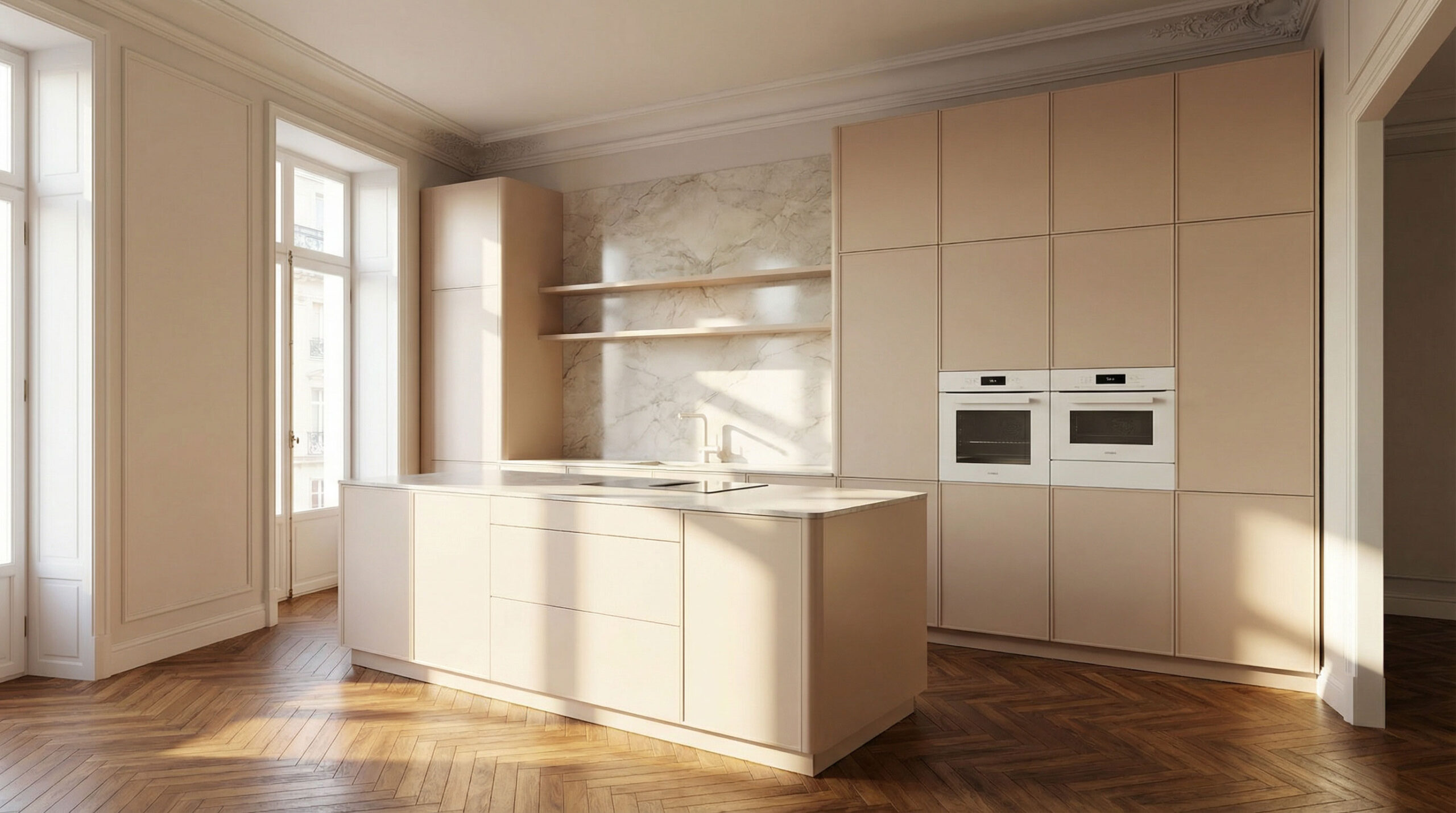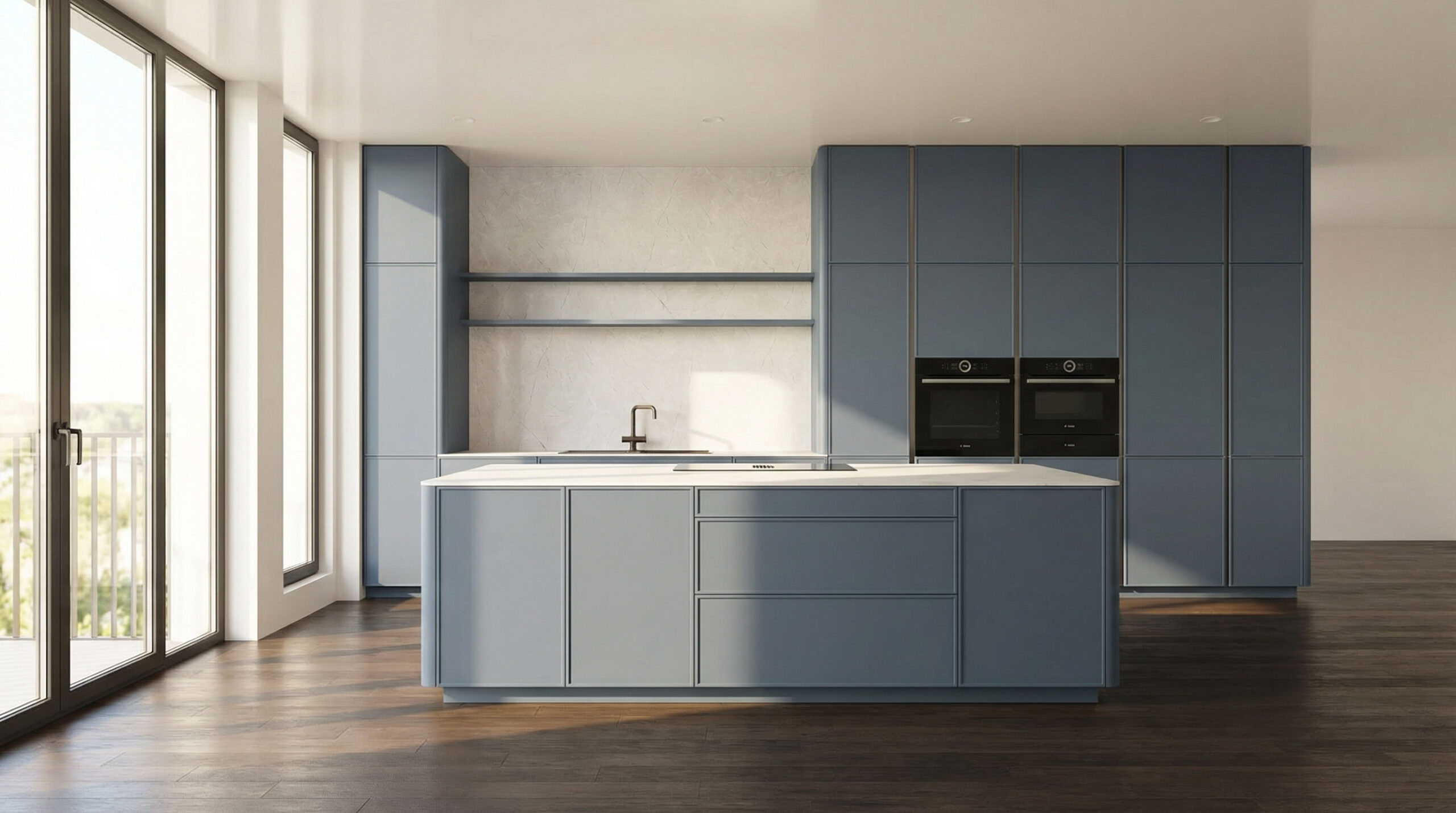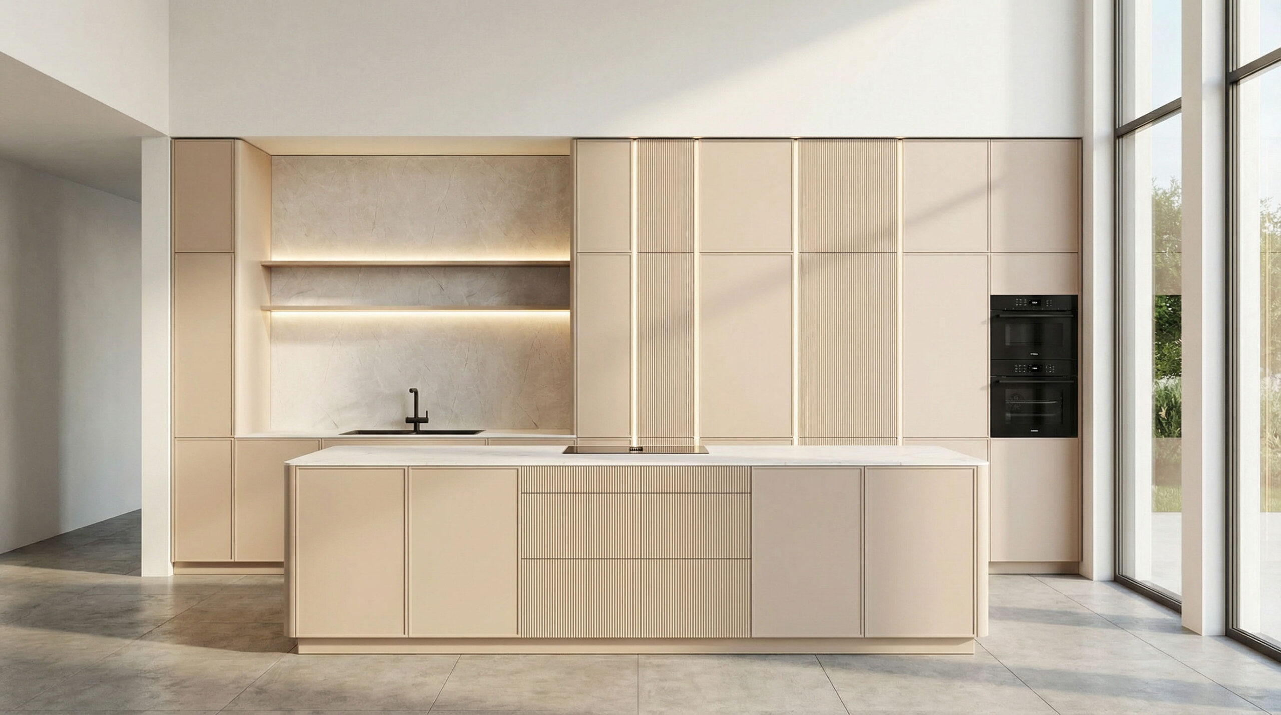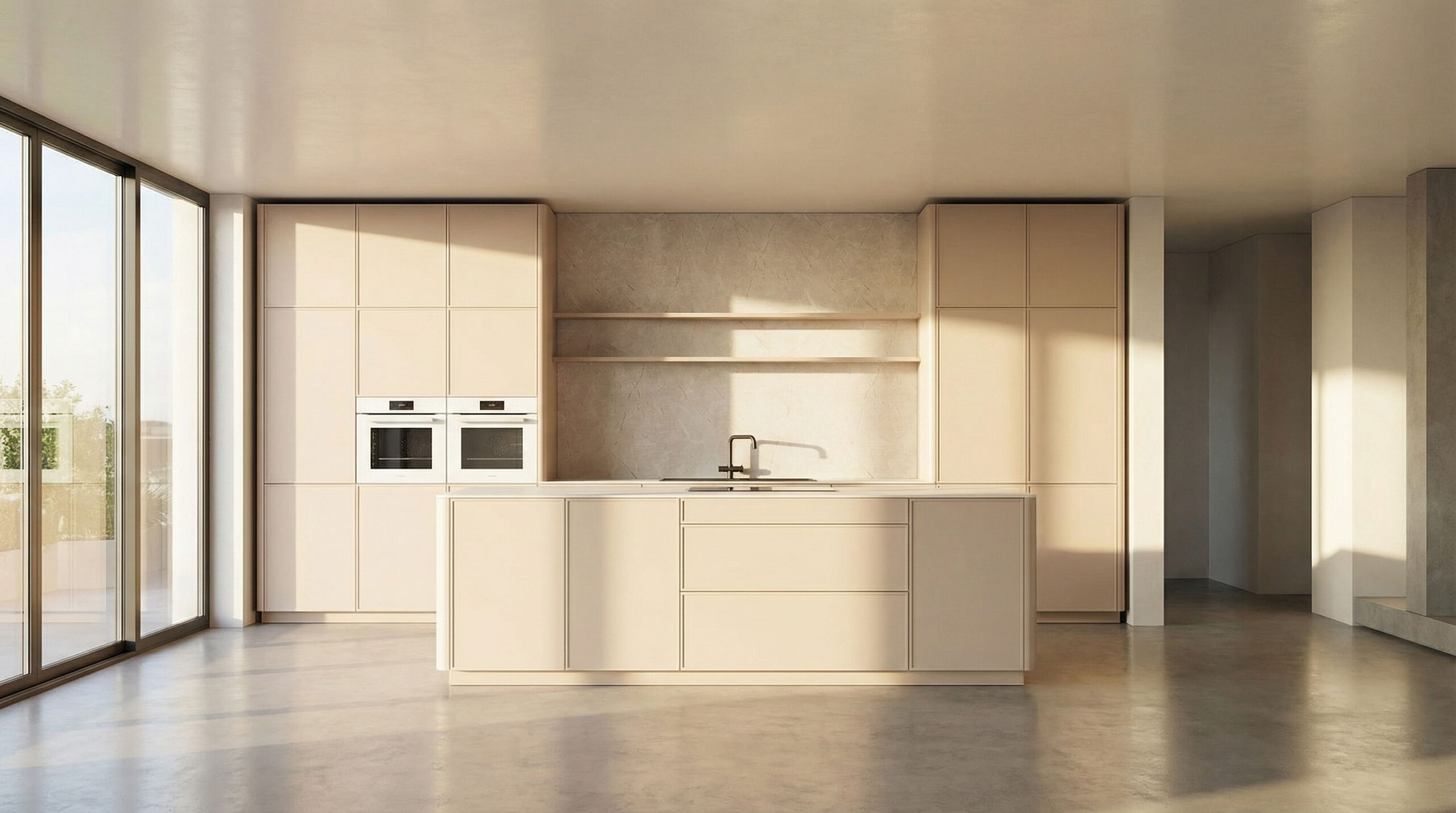 Hinter der ruhigen Optik verbirgt sich ein durchdachtes Innenleben: großzügige Spacetower-Lösungen für ergonomischen Zugriff, ein moderner Apothekerschrank im PURE-Design für perfekten Überblick und flexible Side-by-Side-Schranklösungen, die Ordnung fast selbstverständlich machen. Die Arbeitsplatte und Nischenrückwand in Vicosa unterstreichen den hochwertigen Charakter der Küche. Robust im Alltag, elegant in der Wirkung. Ergänzt wird das Design durch Bronze-Metallrahmen mit klarem Rillenglas, die moderne Leichtigkeit und Eleganz verbinden.
