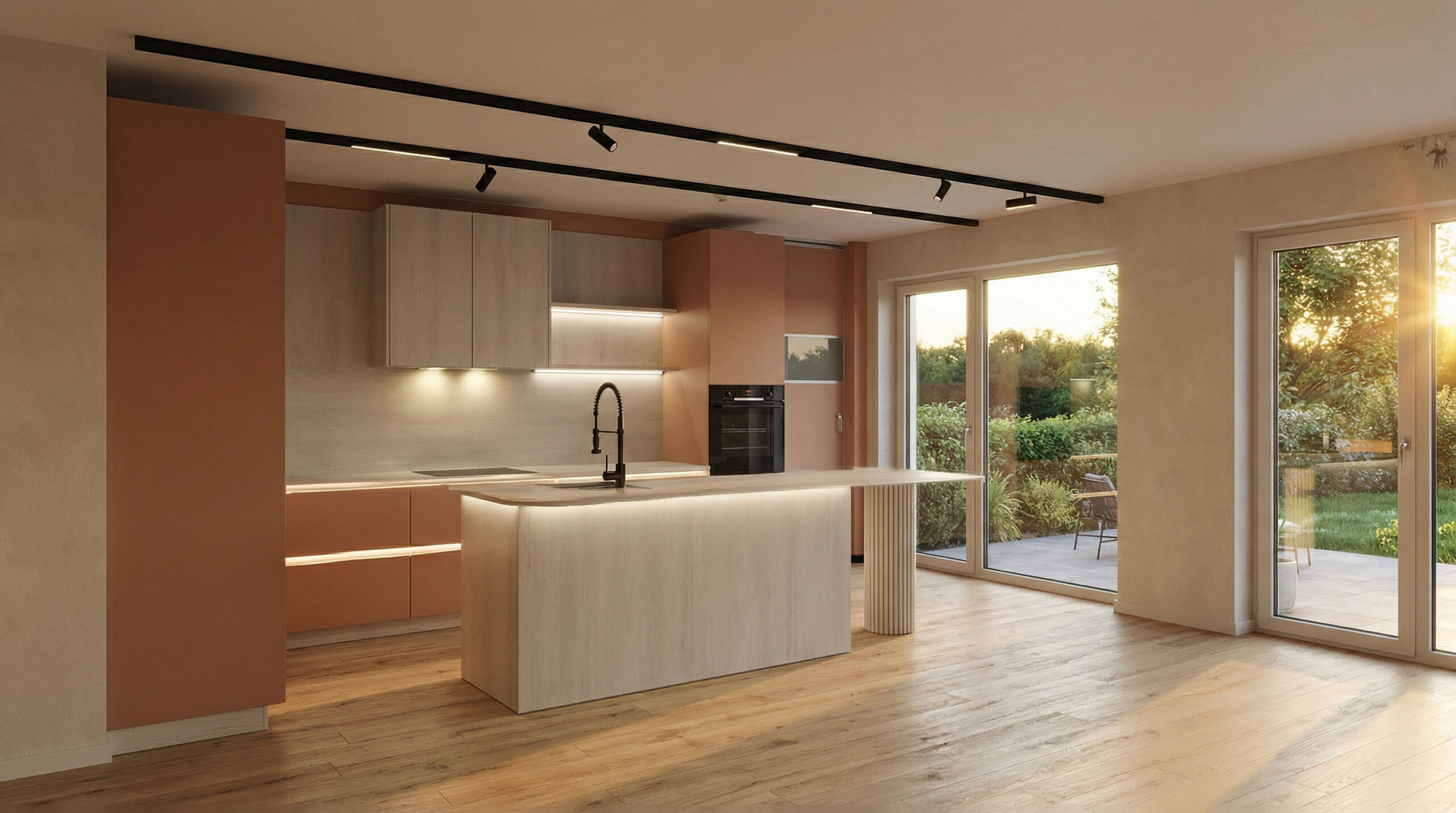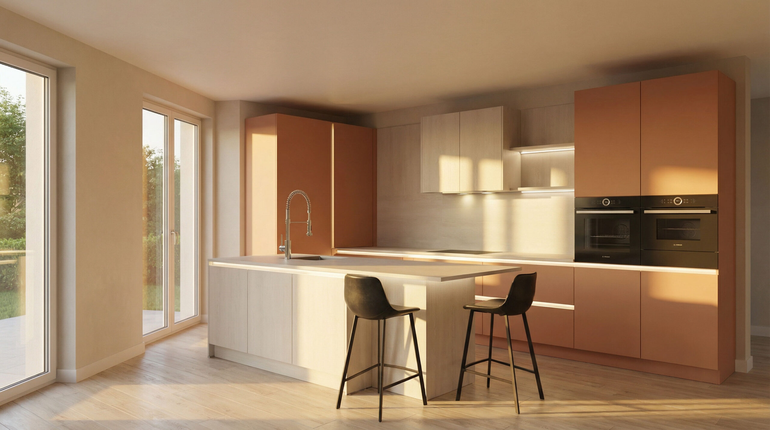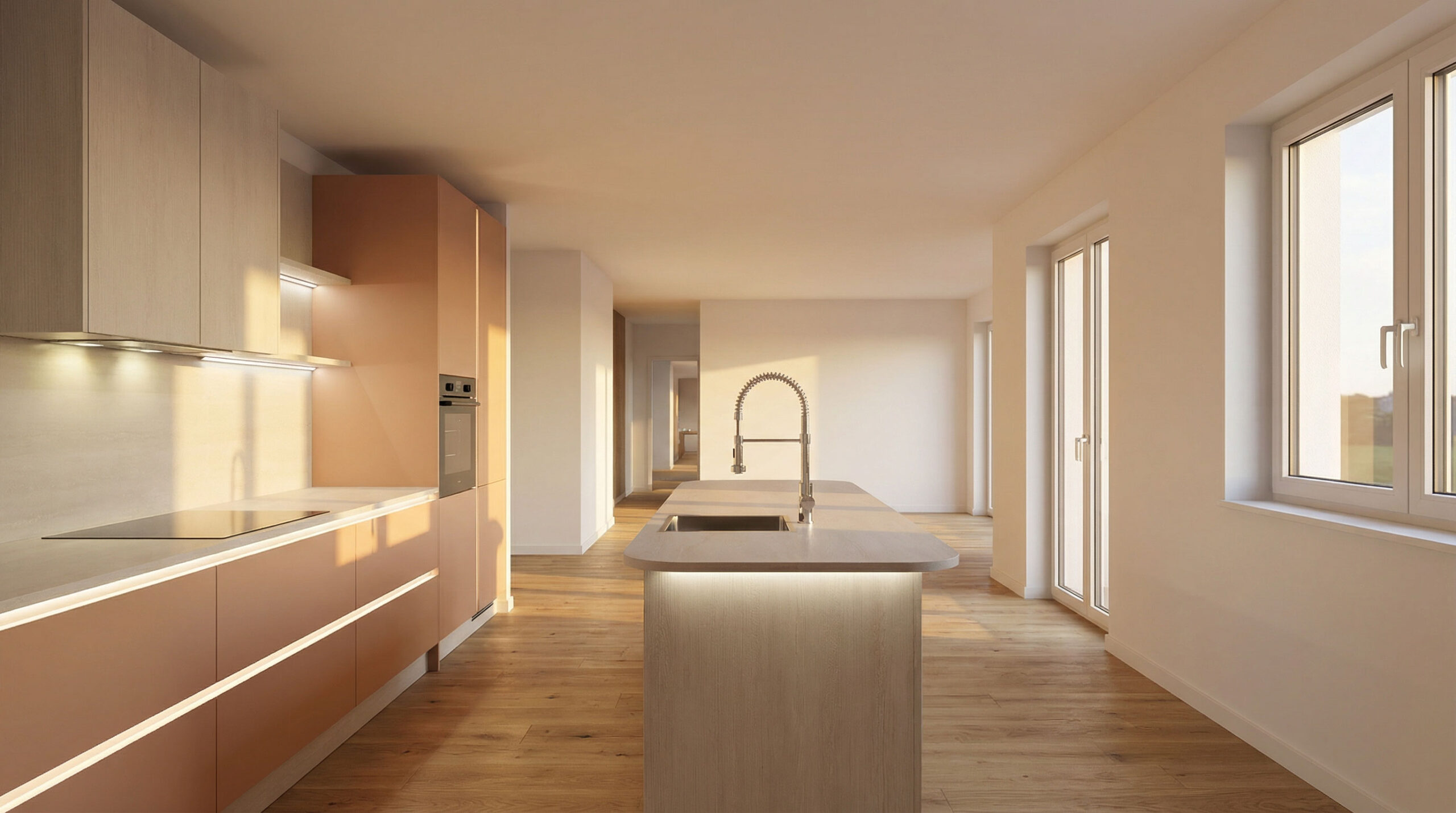 Zentrales Gestaltungselement sind die Fronten Cindy 250 Blush seidenmatt (C18/lp, PG 1). Der warme Blush-Ton bringt Weichheit und Wohnlichkeit in das ansonsten mineralisch geprägte Design. Die matte Oberfläche wirkt ruhig, hochwertig und modern zugleich. Kombiniert wird das mit der Strukturfront Leni 190 – Stone Groove (L26/lp, PG 1). Die geriffelte Steinoptik erzeugt durch die feine Linienstruktur eine markante Tiefenwirkung und verleiht der Küche eine skulpturale Präsenz.