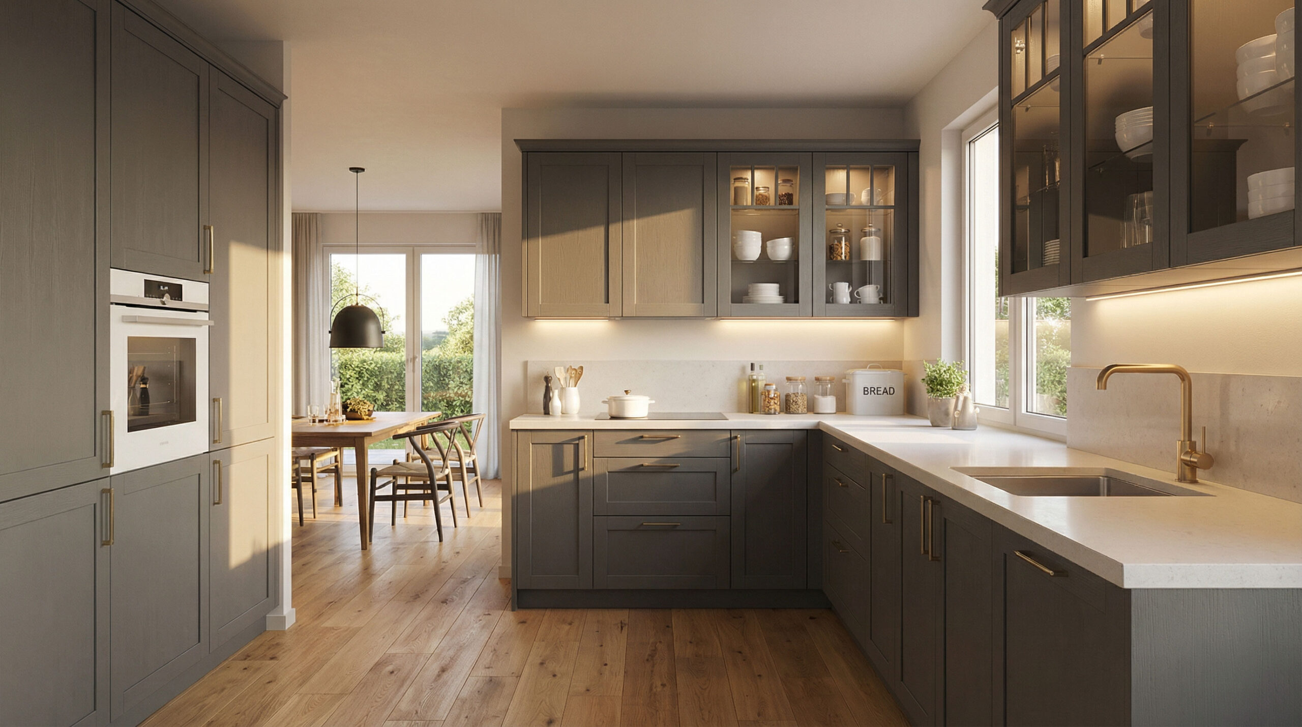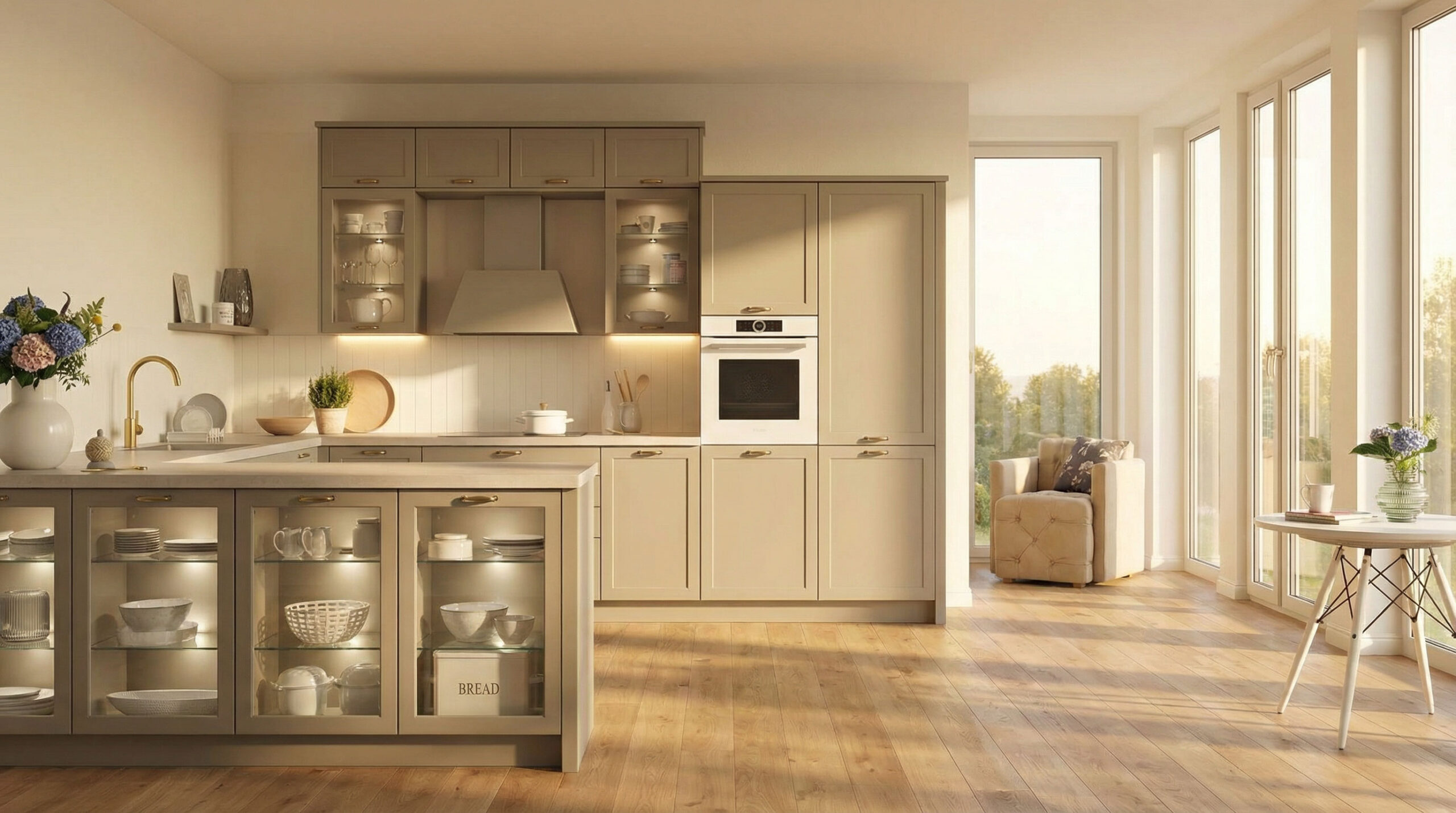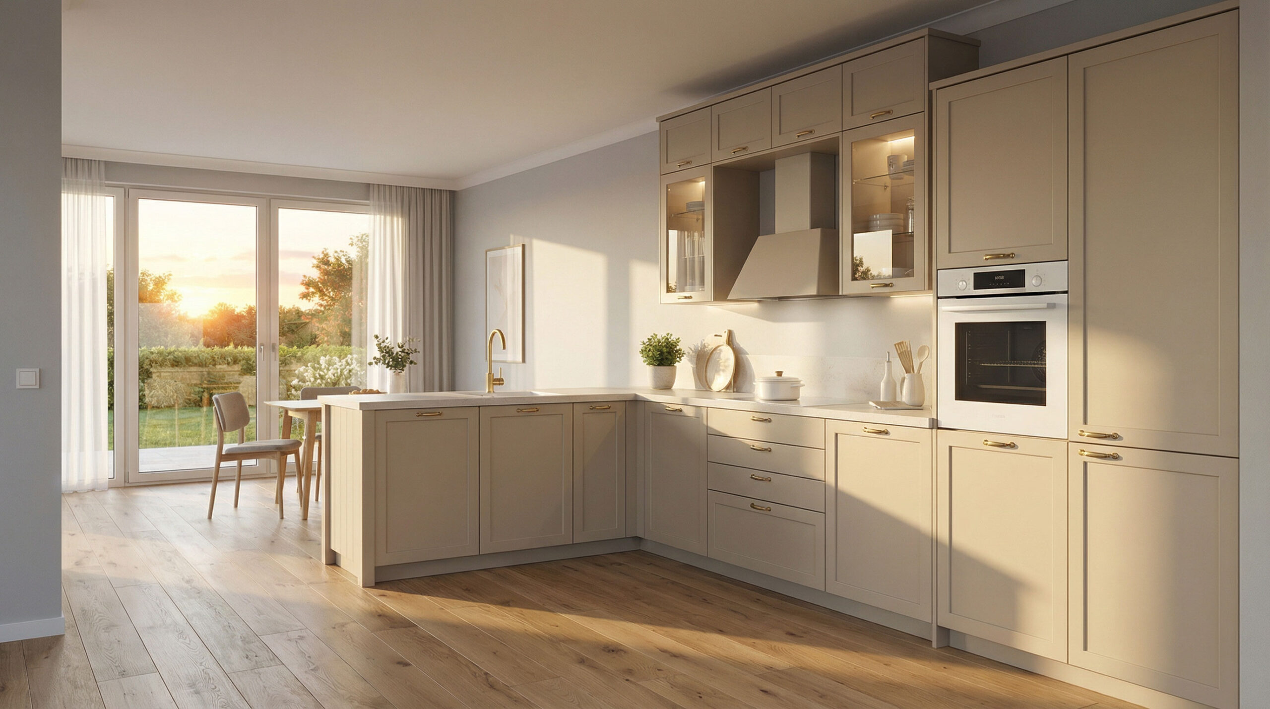 Greige – die sanfte Trendfarbe aus Grau und Beige – setzt den Ton für eine Küche, die beides kann: Cottage- Gefühl und modernste Technik. Natürlich ergänzt durch Details,