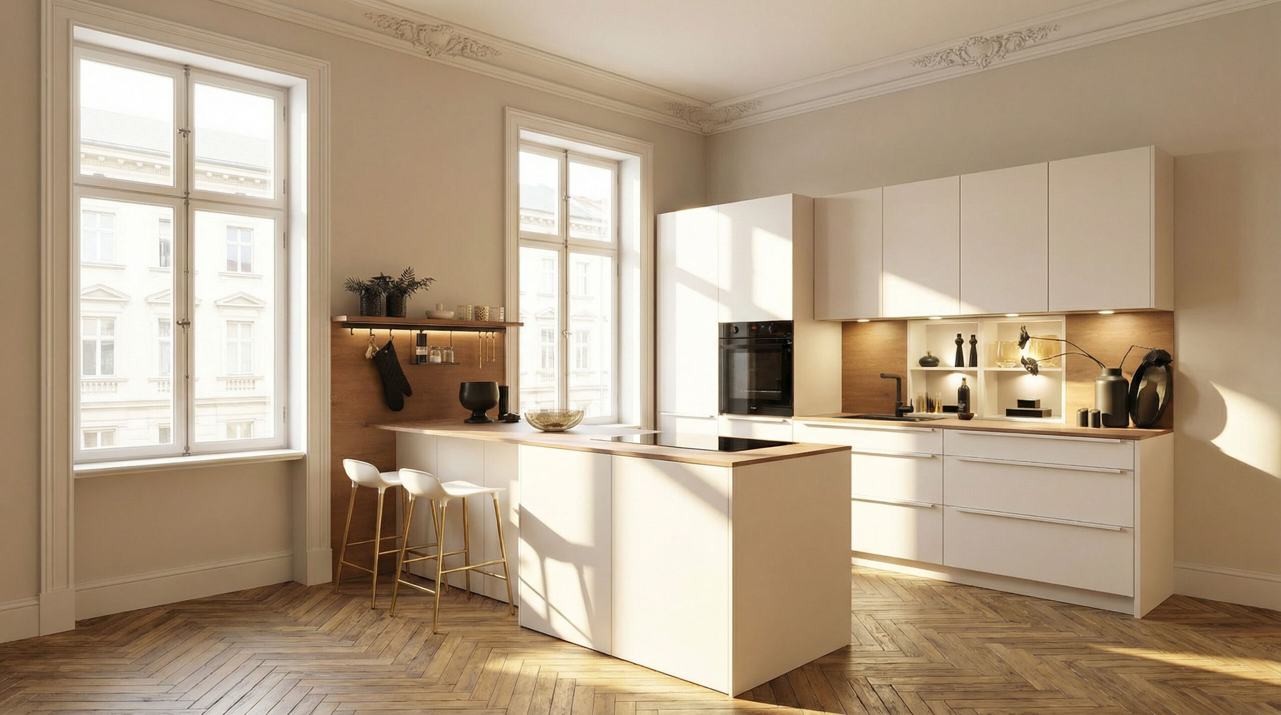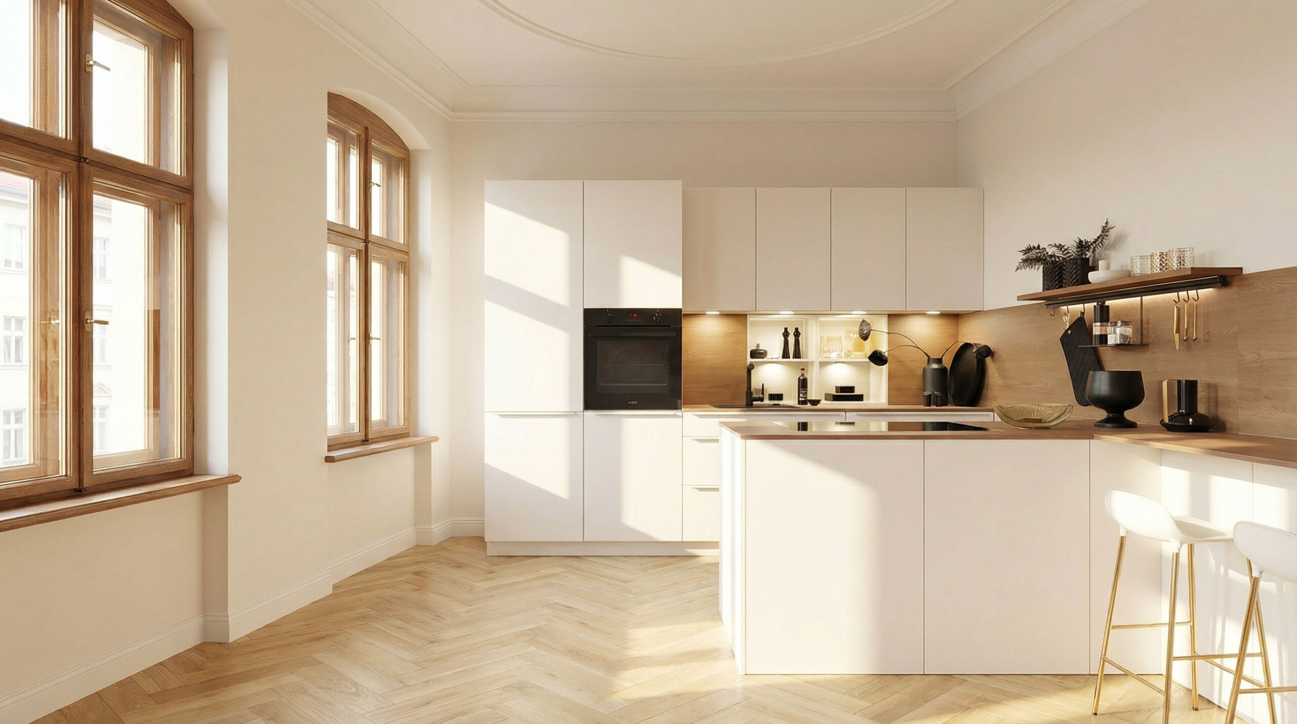 Die Nische ist ebenfalls in 139 Eiche Cognac gestaltet und bildet einen ruhigen, natürlichen Hintergrund für den Arbeitsbereich. Als Griff kommt 256 Sandbeige zum Einsatz – dezent, technisch präzise und perfekt auf die Frontfarbe abgestimmt. Neben der stimmigen Gestaltung überzeugt das Burger Produkt durch zahlreiche funktionale Details, wie die Unterschränke in 710 mm Übertiefe. Sie bieten deutlich mehr Stauraum als Standardlösungen und schaffen großzügige Arbeitsflächen. Die Hochschrankzone ist mit bodentiefen Türen ausgeführt und wirkt wie eine geschlossene Wandfläche. Ergänzt wird diese Zone durch einen Designkorpus in Sandbeige seidenmatt, der die hochwertige Optik auch im Innenbereich konsequent fortführt. Ein weiteres Highlight ist der Hängeschrank mit Bar-Klappe.