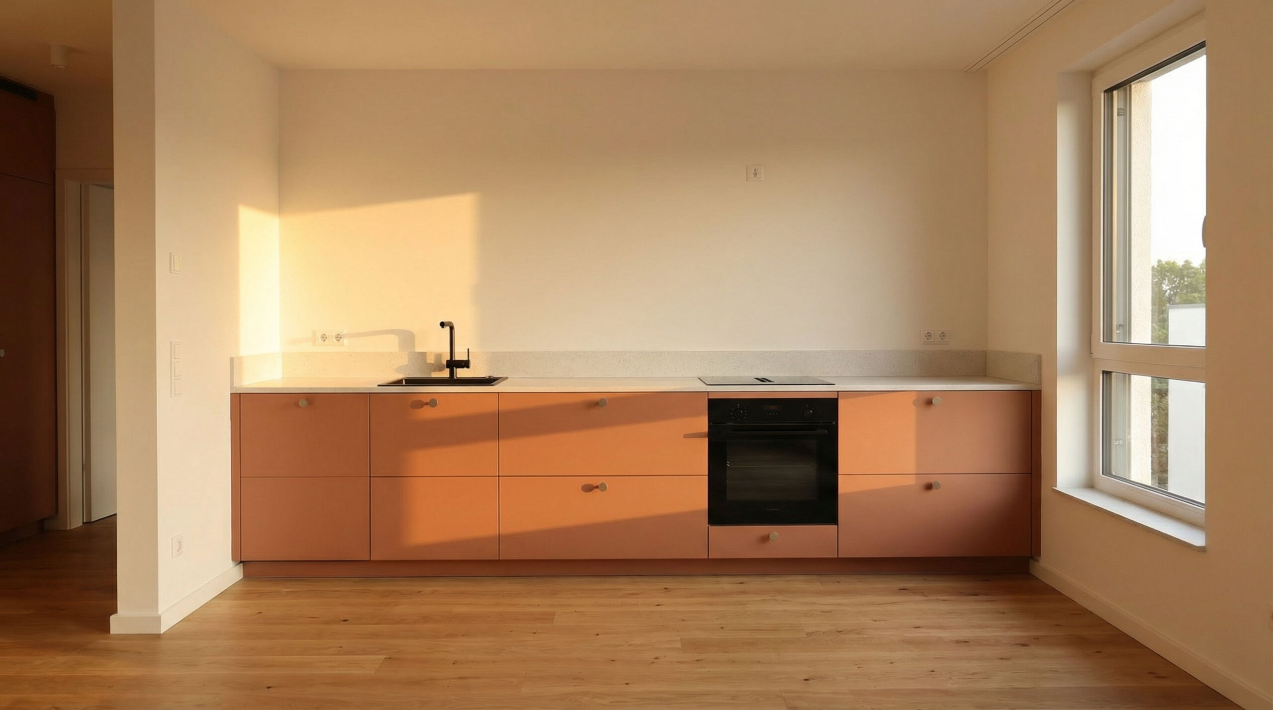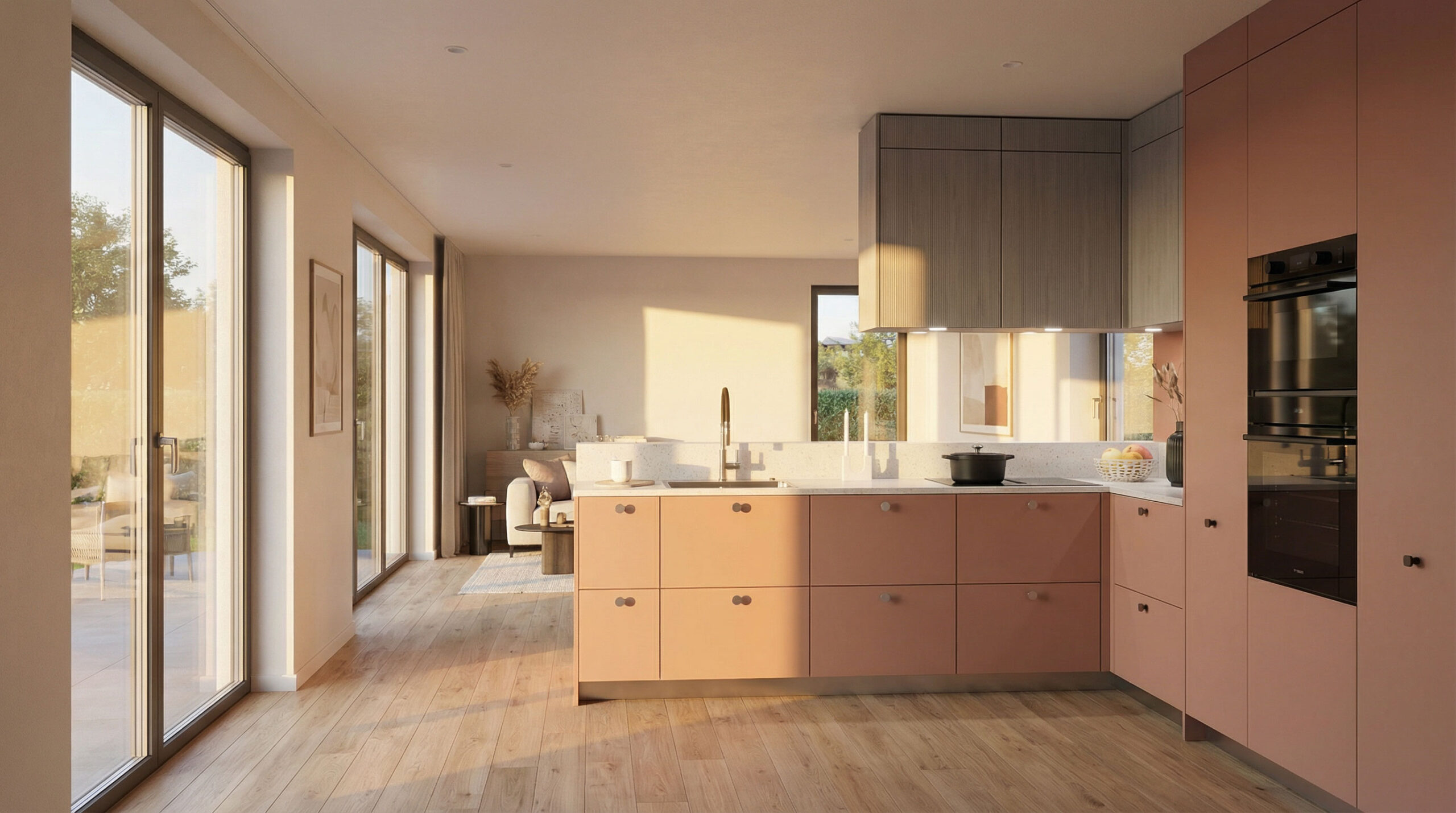 Gestalterisch prägend bei dieser überaus schicken Serie ist die Kombination aus zwei Frontprogrammen: Die Unterschränke sind in Cindy Blush seidenmatt (C18/lp, PG 1) ausgeführt. Der sanfte, pudrige Roséton bringt Wärme, Eleganz und eine überraschend wohnliche Leichtigkeit in den Raum. Die seidenmatte Oberfläche wirkt ruhig, hochwertig und reflektiert das Licht angenehm weich. Dazu treten Hochschränke und Seitenschränke in Marie Eiche hell (M20/lp, PG 2). Das helle Holzdekor bringt Natürlichkeit und Struktur ins Design und verleiht der Küche eine zeitlose, freundliche Ausstrahlung. Als verbindendes Element fungiert die Arbeitsplatte in 984 Terrazzo, die sich auch in der Nische (540 Terrazzo) wiederfindet. Der Korpus ist in 133 Eiche hell ausgeführt und fügt sich harmonisch in das Gesamtbild ein. Sockel und Sichtseiten in FG 438 Edelstahlfarbig setzen einen klaren, technischen Akzent und verleihen der Küche eine elegante Leichtigkeit. Die Griffe in 122 edelstahlfarbig greifen diesen Charakter auf und unterstreichen die präzise, moderne Linienführung. Die ergonomische Arbeitshöhe von 796 mm sorgt dabei für optimale Arbeitsbedingungen im Alltag.