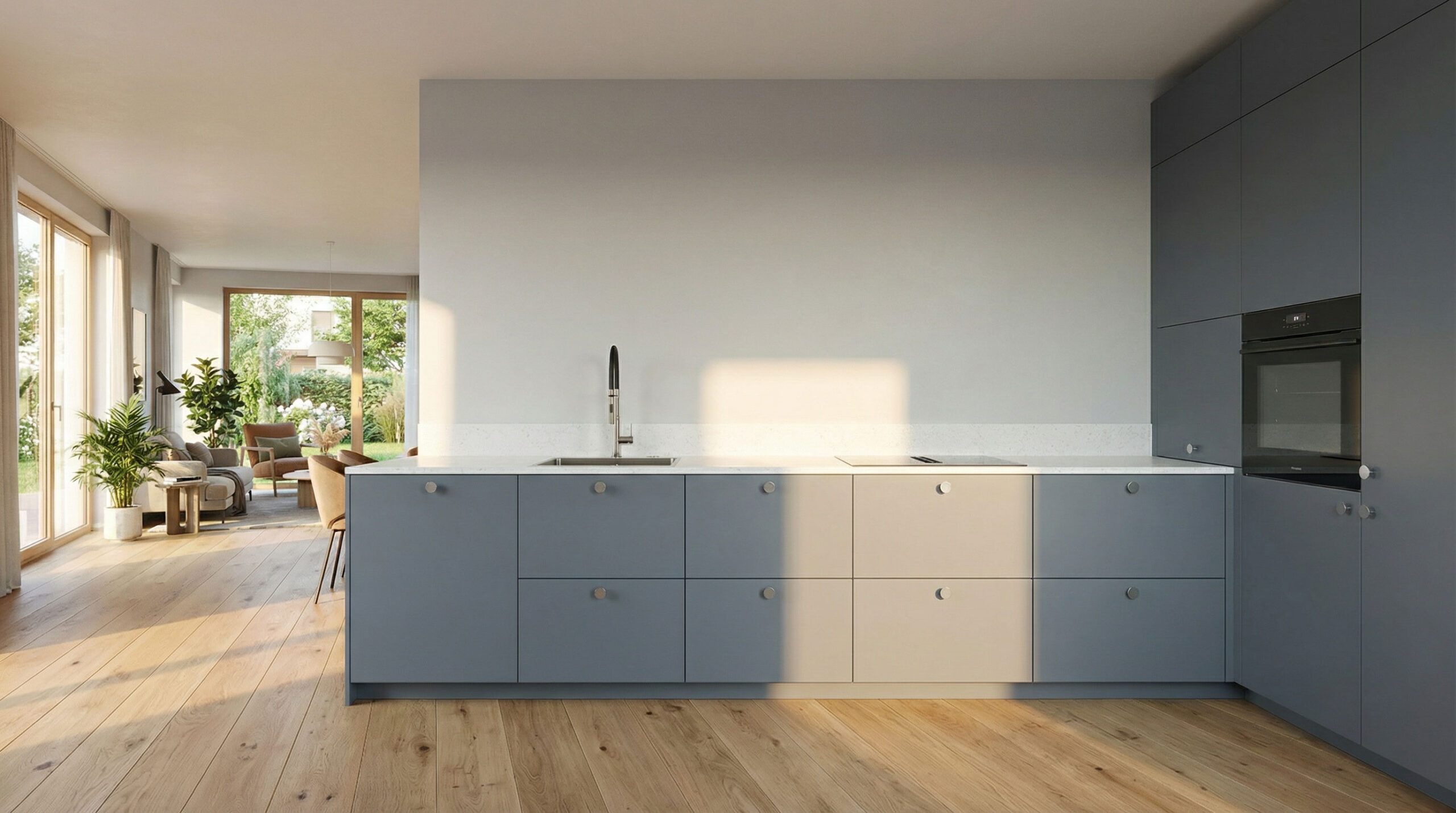 Ergänzt wird das Stauraumkonzept durch einen Aufsatzschrank mit Lifttür (Sonderanfertigung), der komfortablen Zugriff auf häufig genutzte Geräte ermöglicht, sowie durch praktische Tablarauszüge, die Arbeitsgeräte und Vorräte übersichtlich und ergonomisch erreichbar machen. Die Aufsatzschränke in 560 mm Tiefe bieten deutlich mehr Stauraum als klassische Oberschränke und schaffen großzügige, gut organisierte Stauräume – ein klarer Vorteil für ambitionierte Nutzer. Ein Seitenschrank mit durchgehender Tür wirkt wie eine geschlossene Wandfläche und unterstreicht den architektonischen Anspruch der Planung. Die Küche erhält dadurch eine ruhige, klare Gesamtwirkung, bei der Technik und Stauraum elegant in den Raum integriert sind. Auch im Innenleben zeigt sich der hohe Qualitätsanspruch: Der Besteckeinsatz aus Eiche hell sorgt für perfekte Organisation und eine wertige Haptik bis ins Detail. Für zusätzlichen Komfort sorgt die Schrankinnenbeleuchtung DELANO, die alle Stauräume perfekt ausleuchtet und zugleich ein stimmungsvolles Lichtambiente schafft.