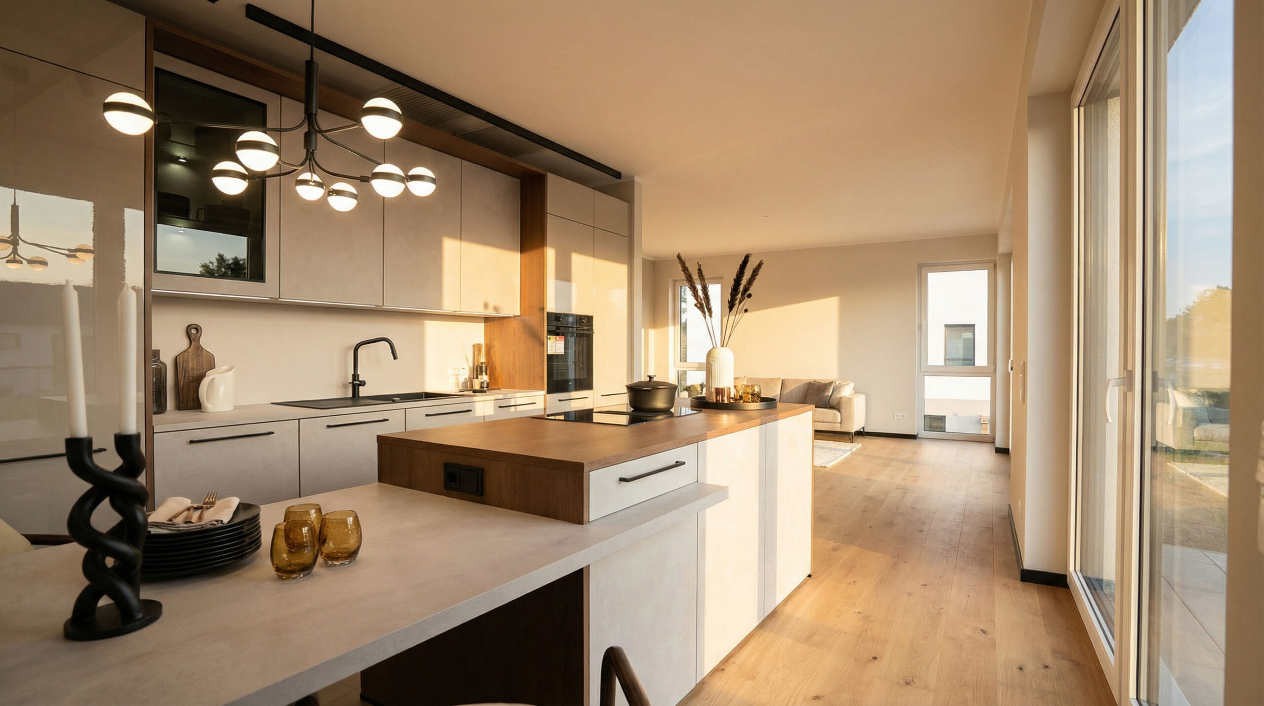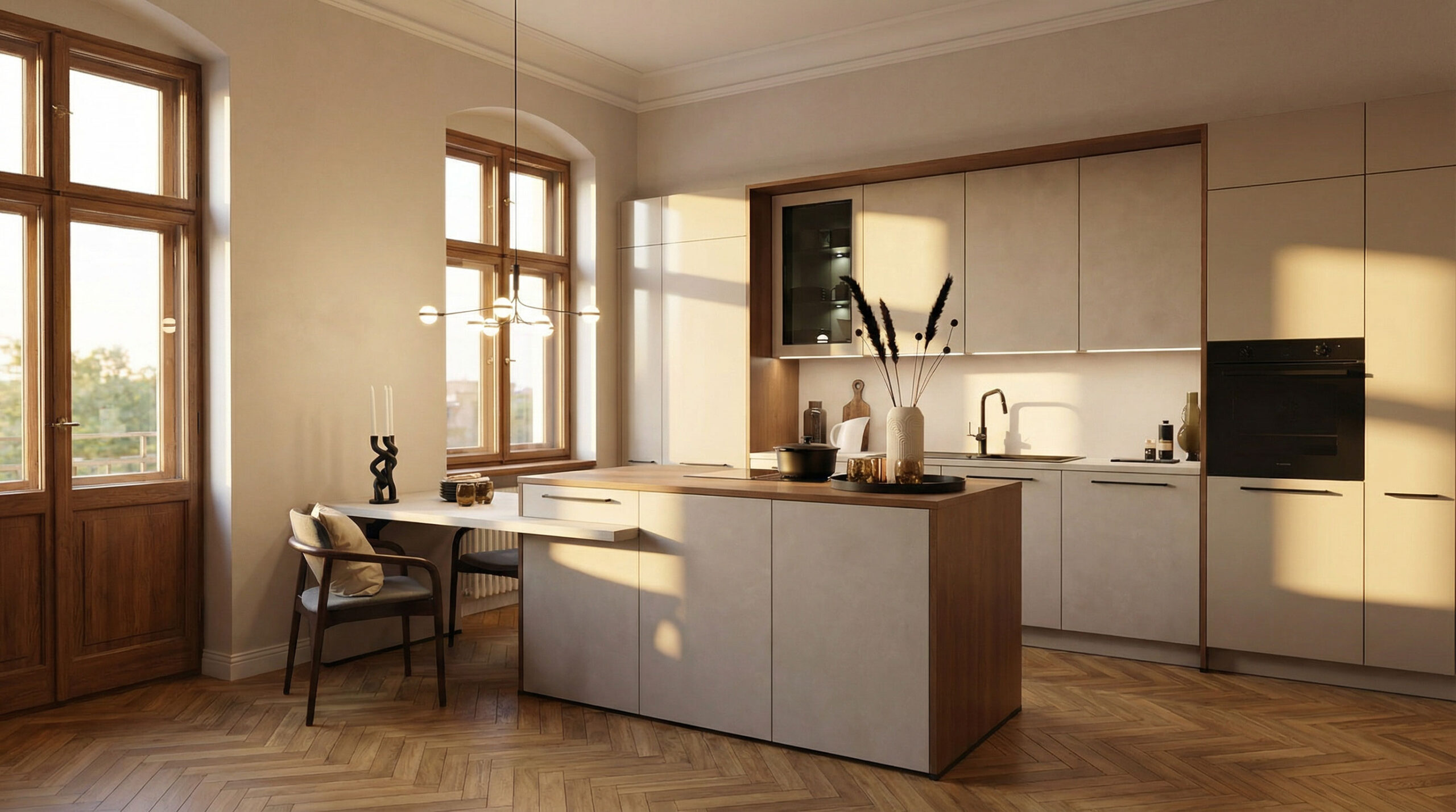 Die Planung setzt auf Rahmenarchitektur mit bodentiefen Türen und einer konsequenten Linea-Optik: horizontale Linien, ruhige Flächen und eine präzise Gliederung schaffen eine wandartige Präsenz, die Technik und Stauraum elegant integriert. Die Basis bildet Amelie Sand (A13/lp, PG 1), ein warmer, freundlicher Sandton, der Leichtigkeit und Zeitlosigkeit vermittelt. Ergänzt wird sie durch Susann Greige Hochglanz (S12/lp, PG 2), deren brillante Oberfläche Licht aufnimmt und dem Ensemble eine elegante Tiefe verleiht. Die Arbeitsflächen greifen die warme Materialwelt auf: Arbeitsplatte 979 Sand fügt sich nahtlos in die Sand-Farbigkeit ein, während 987 Eiche Cognac als Alternative oder Akzent die natürliche, wohnliche Note verstärkt. In der Nische setzt das neue Motiv „Retro“ (663 Retro) einen charaktervollen Blickfang – grafisch, zeitgemäß und mit klarer Referenz an ikonische Muster.