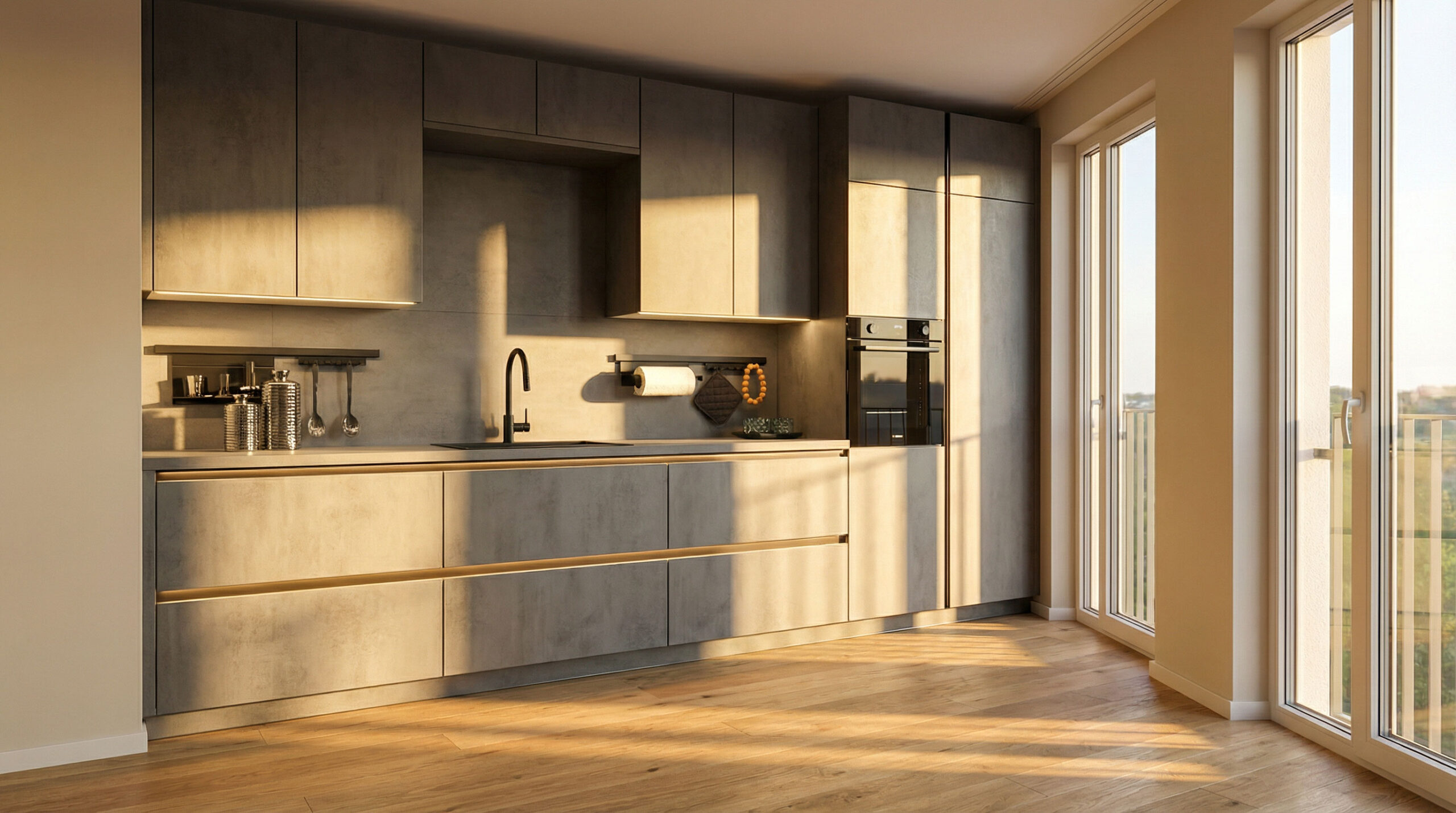 Die Küche ist mit TIP ON ausgestattet und ermöglicht damit eine grifflos-unterstützte Öffnung für ausgewählte Elemente – ein Plus an Komfort und Designruhe. Ein zentrales Funktionsmerkmal ist der Vorratsauszugschrank im ESSENTIO-Design. Ergänzt wird das Stauraumkonzept durch den Cusio-Besteckeinsatz mit Gewürzen, der Ordnung bis ins Detail bringt und Arbeitsprozesse spürbar beschleunigt. Für perfekte Ausleuchtung sorgt die Derby-Beleuchtung, die gezielt Arbeitszonen akzentuiert und zugleich eine stimmungsvolle Inszenierung der Betonoptik ermöglicht. Zusätzlich bringt die Schrankinnenbeleuchtung DELANO Licht in alle Stauräume und erleichtert die Orientierung – funktional und atmosphärisch zugleich. Ein weiteres Detail mit hohem Praxisnutzen ist die Nischenreling EASY. Für den Wasserplatz kommt die neue Armatur von Wasserwerk zum Einsatz – technisch präzise, hochwertig verarbeitet und als Designobjekt im Industrial-Look gesetzt.