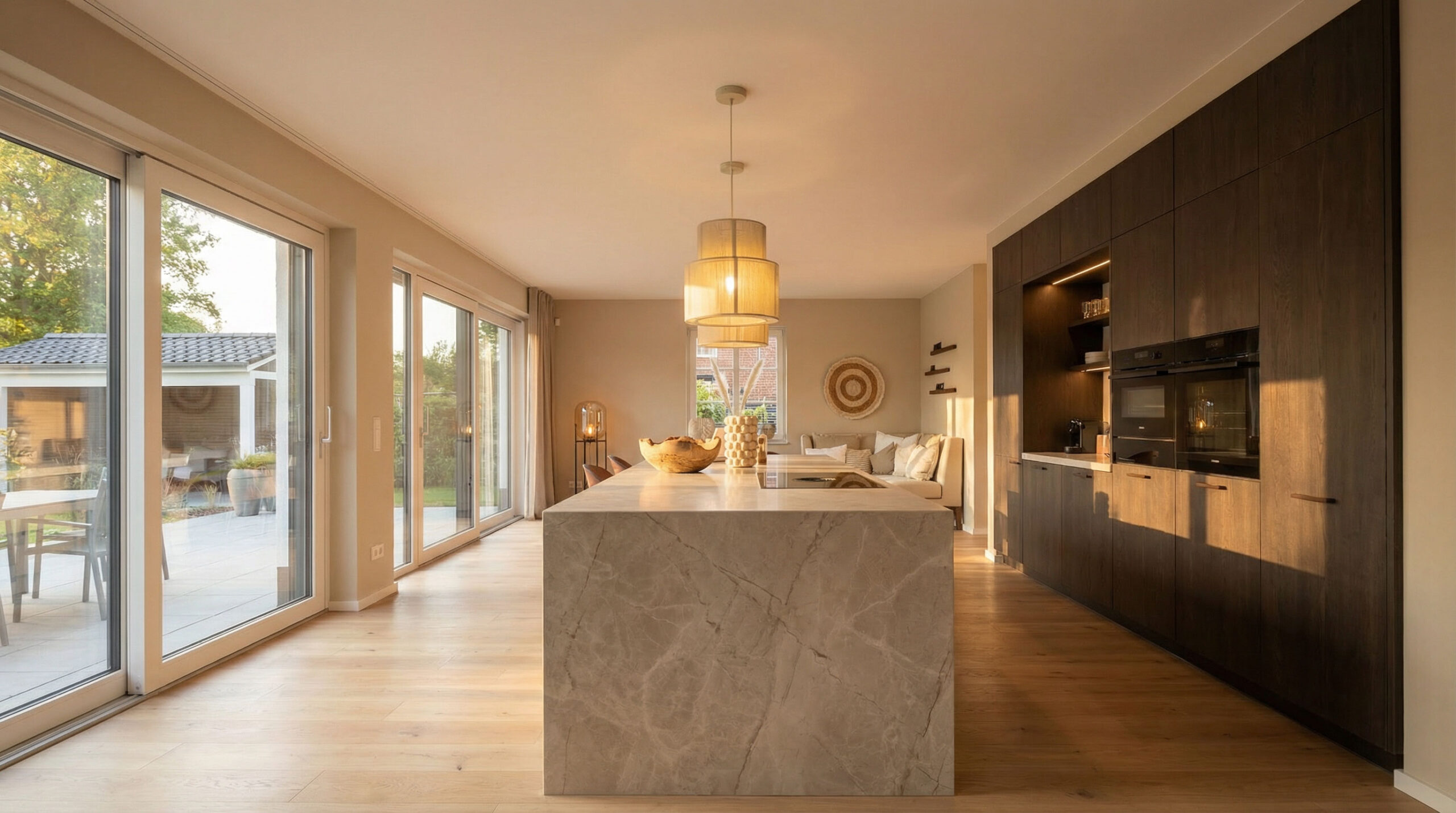 Die Frontgestaltung in diesem Ensemble kombiniert zwei Charaktere: Zum einen die Front Sophie 373 Greige seidenmatt (S13, PG 3), deren samtige Oberfläche für eine ruhige, wohnliche Anmutung sorgt. Ergänzt wird sie durch Marie 154 Eiche geräuchert (M20/lp, PG 2). Die dunkle, geräucherte Holzstruktur bringt Tiefe, Authentizität und handwerkliche Wertigkeit in diese Ausführung. Auch der Korpus, der Sockel sowie die Sichtseiten sind in 127 Greige seidenmatt ausgeführt und schaffen eine durchgängige Linienführung. Als Arbeitsplatte kommt 991 Vicosa zum Einsatz – eine moderne, pflegeleichte Oberfläche mit klarer Anmutung, die den wohnlichen Charakter der Küche unterstreicht. Ein besonderes Statement setzt die 90 mm Pultplatte. Mit ihrer großzügigen Materialstärke wird sie zum skulpturalen Mittelpunkt der Küche und verleiht der Insel eine kraftvolle Präsenz.
